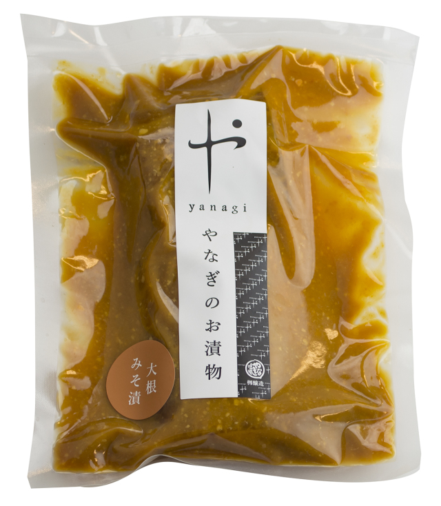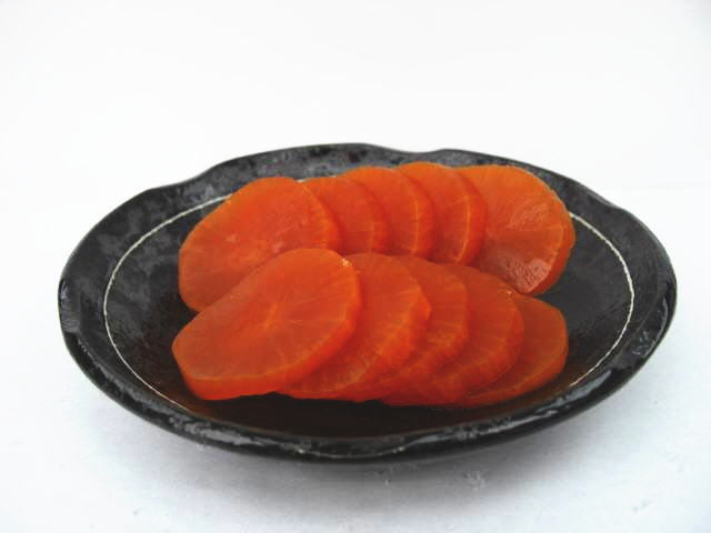 | 原材料名 | 大根 漬け原材料(味噌,アミノ酸液、食塩、発酵調味料、ぶどう糖果糖液糖、 醸造酢、酒粕、唐辛子)、調味料(アミノ酸等)、酒精、リン酸塩(Na)、 保存料(ソルビン酸K)、甘味料(ステビア)、酸味料、着色料(黄4、黄5、赤102、赤106)、V..B1、 (原材料の一部として大豆、小麦を含む) |